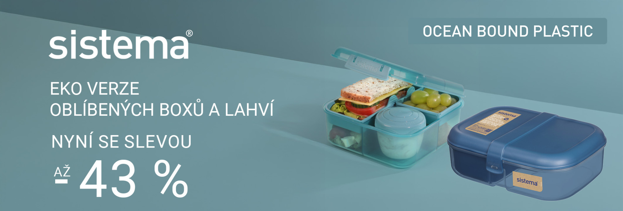 Řada krabiček a láhví Sistema® Ocean Bound je vyrobená z 35 - 50 % plastu sesbíraného z vodních toků, pláží a pobřeží. Objevte krásné odstíny Teal Stone a Mountain Blue.